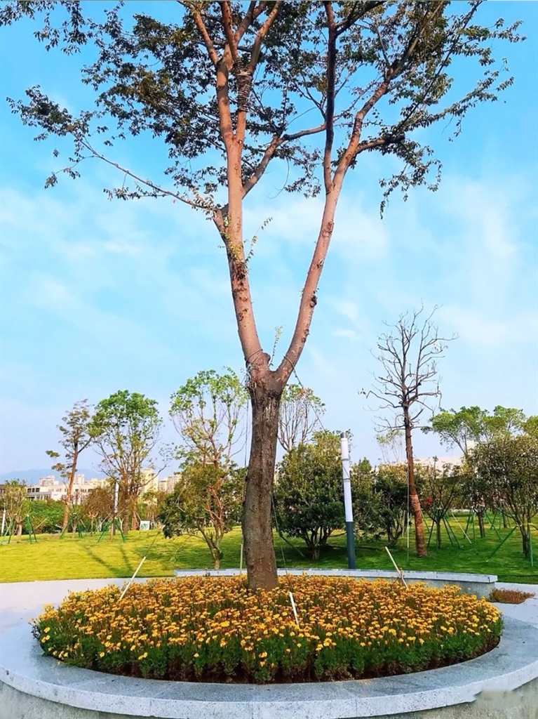 县城新区中心湖公园的一棵树如此受优待。2022年9月27日摄